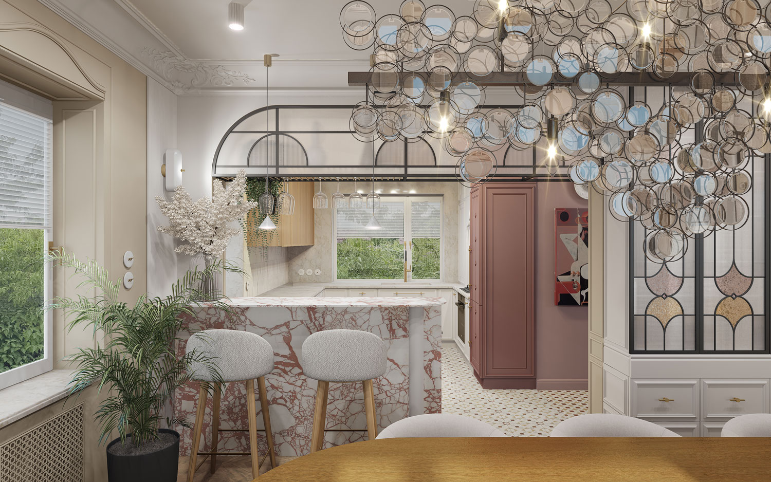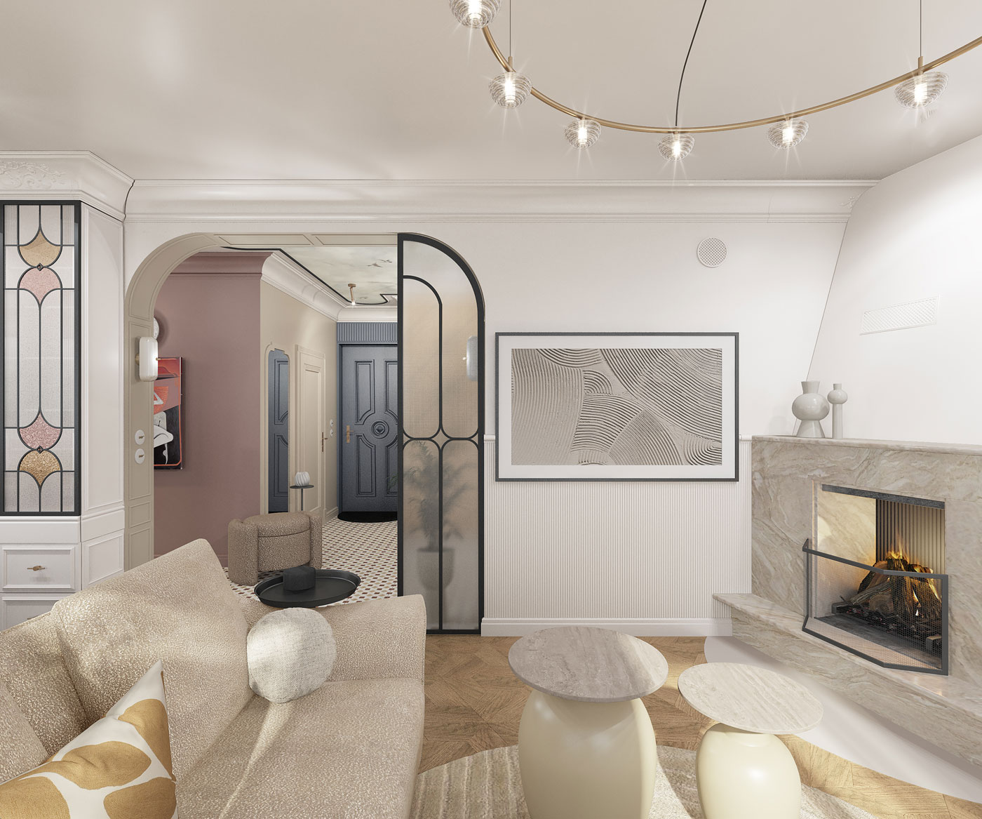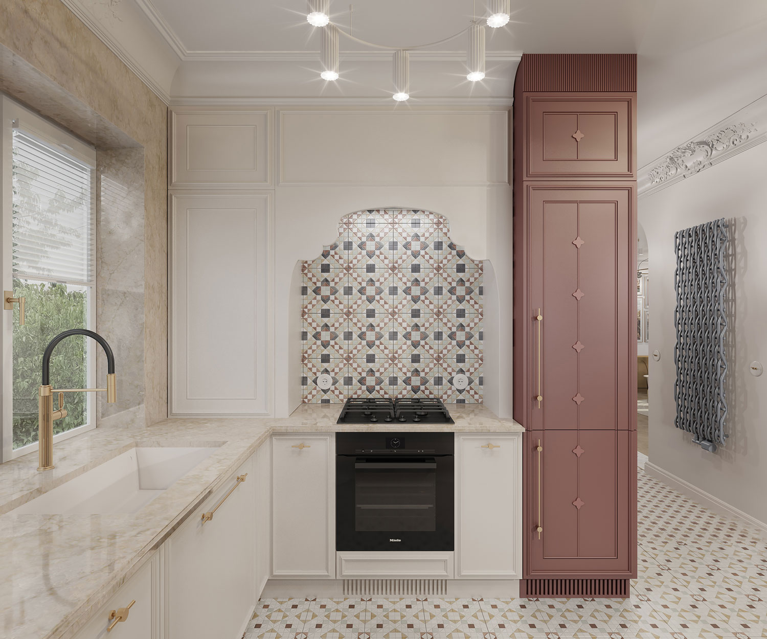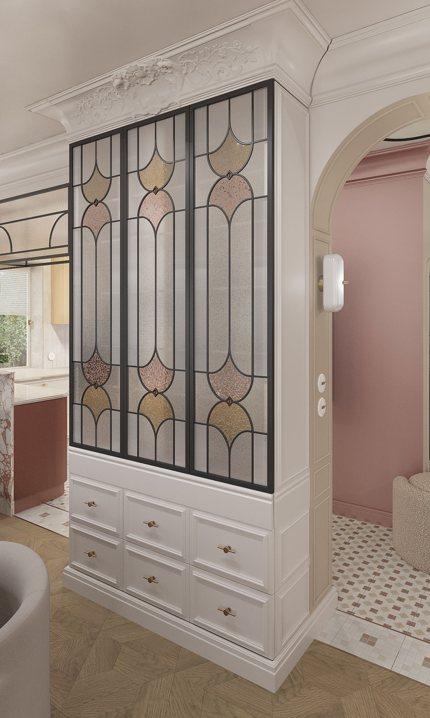 Wnętrza oparte są na jasnym drewnie, beżu i bieli, które zostały zrównoważone mocnymi akcentami bordo, różu i szarego błękitu. Ta zmysłowa paleta przejawia się w płytkach z finezyjnymi wzorami oraz w indywidualnie zaprojektowanych meblach — od witrażowych kredensów po dekoracyjne, portalowe wejścia.