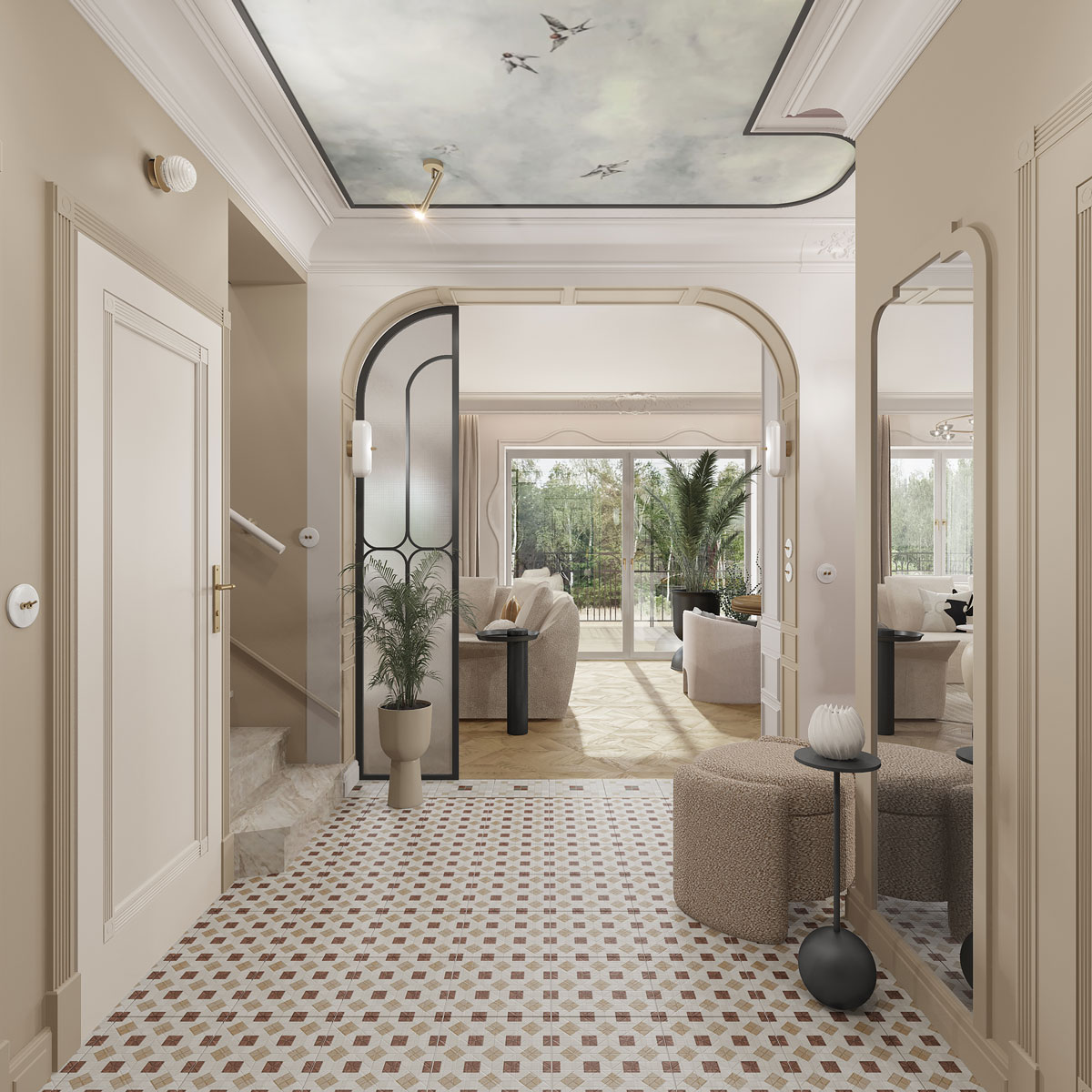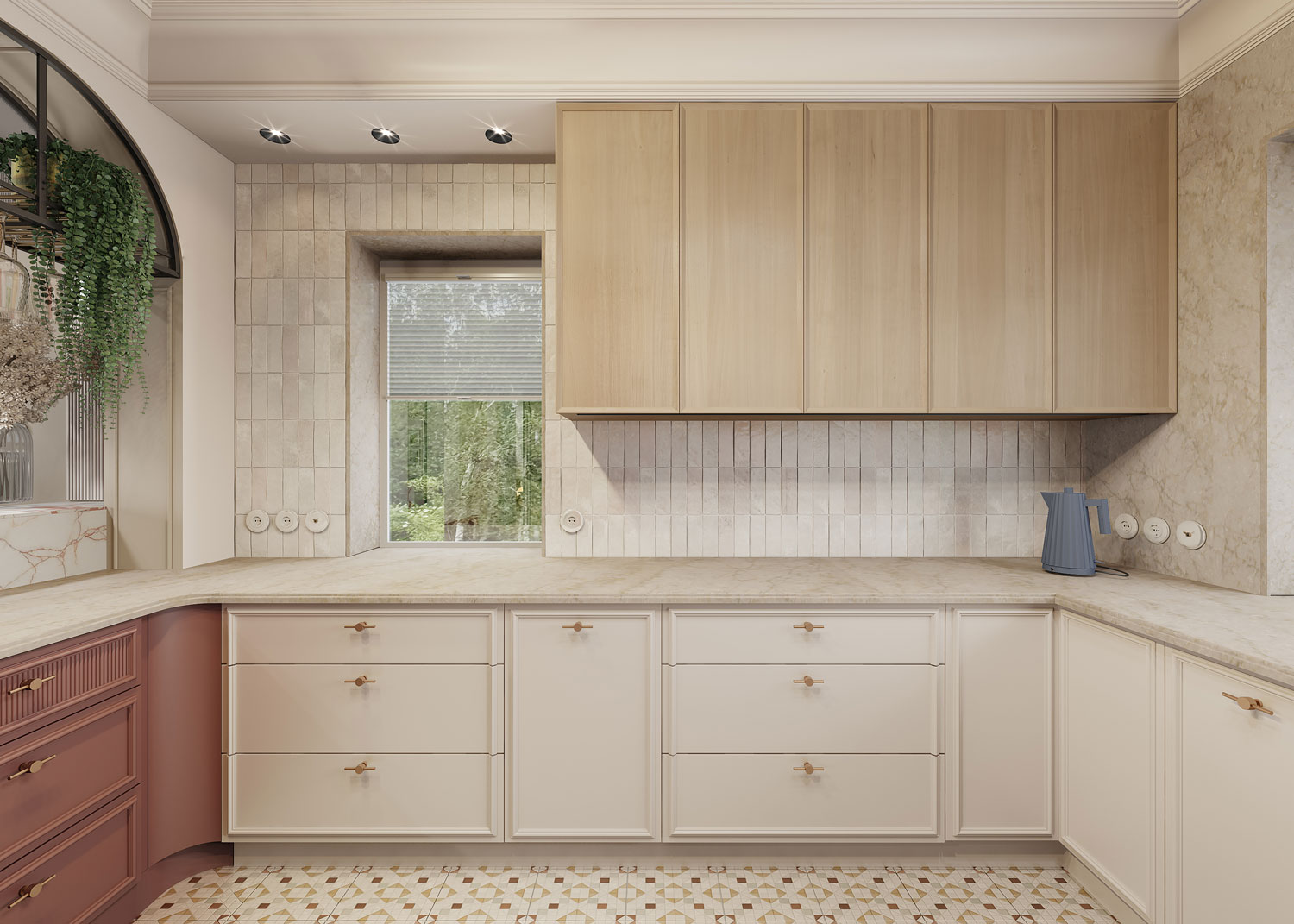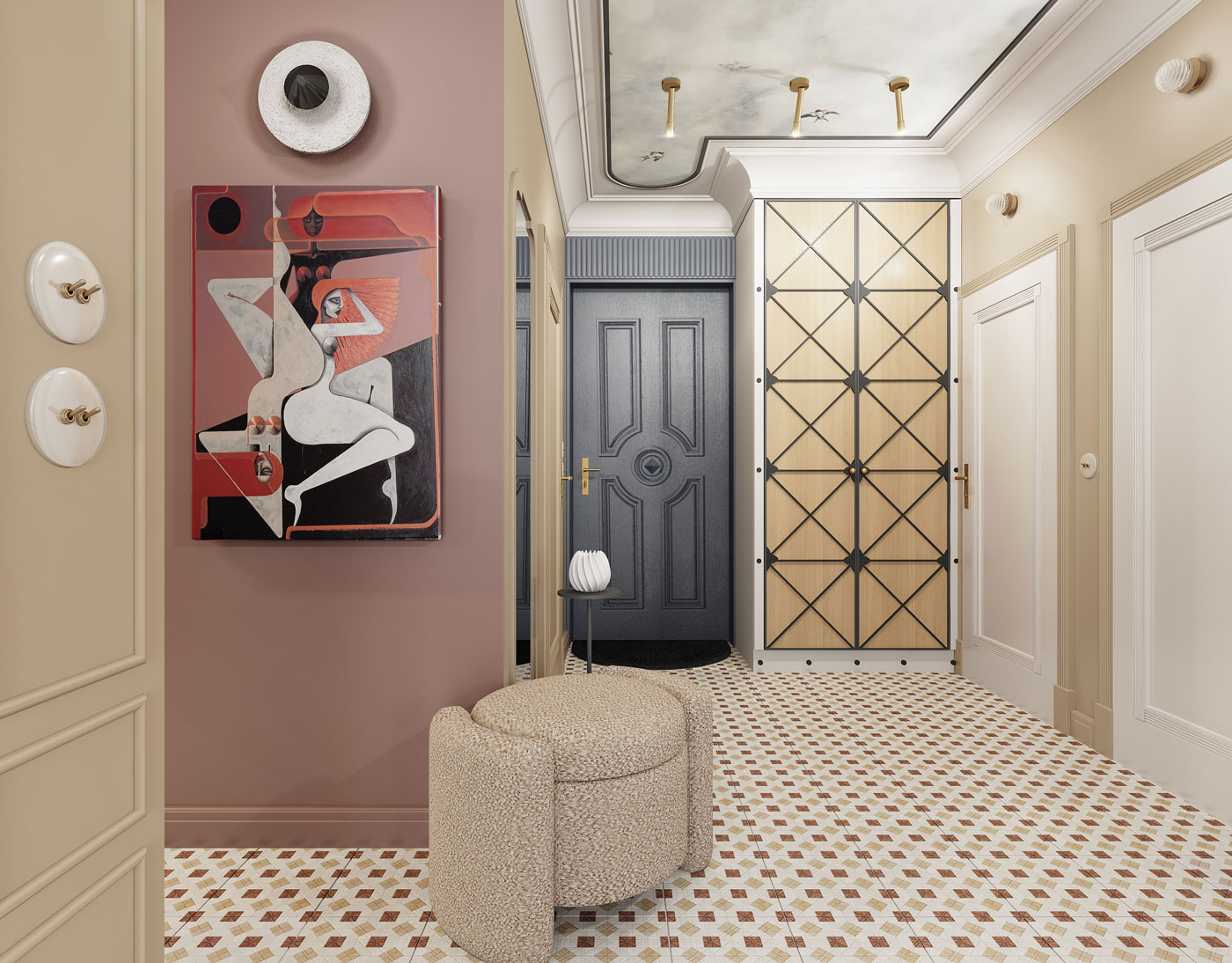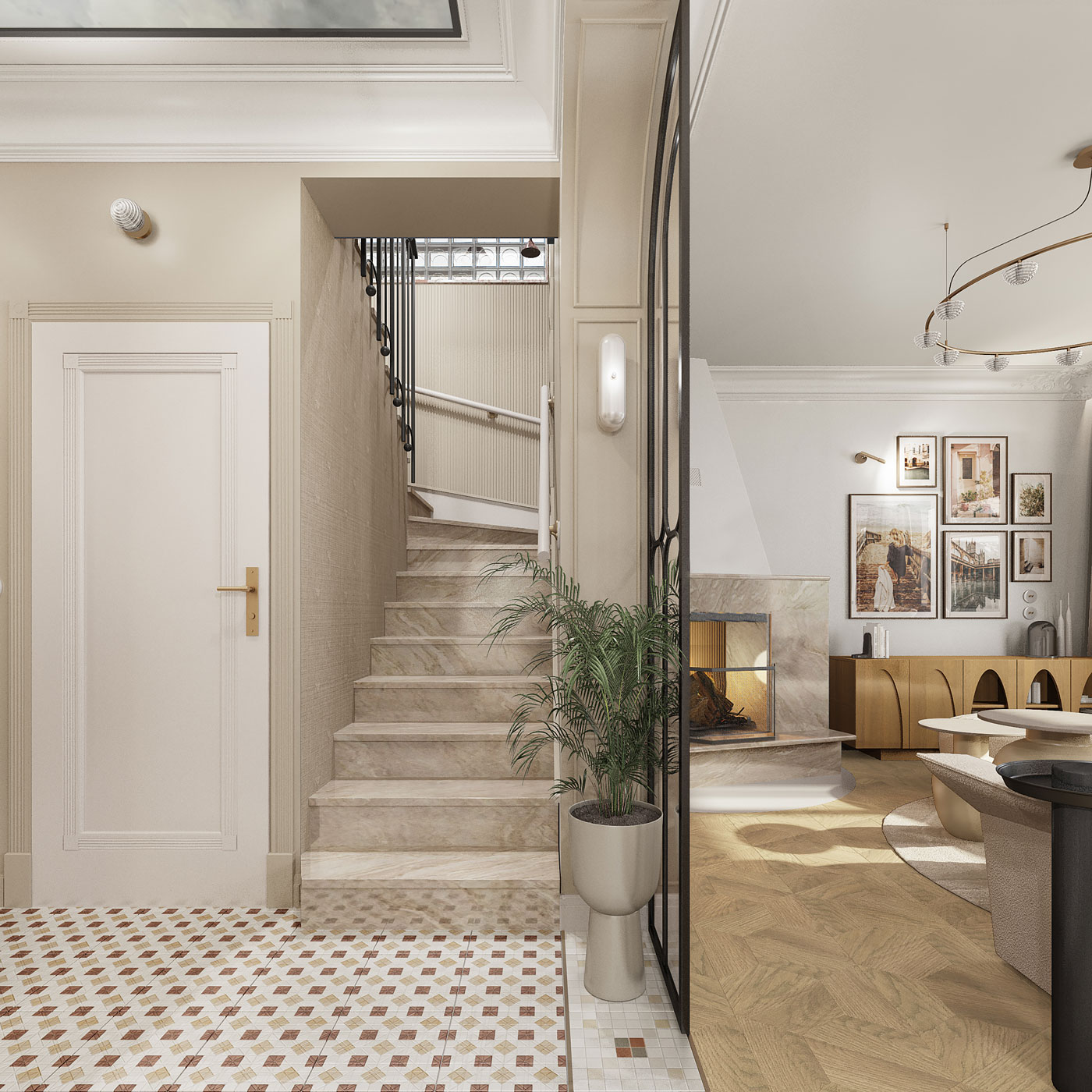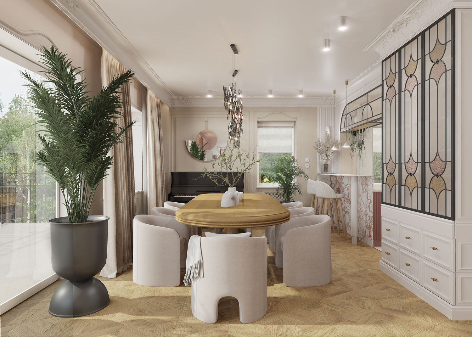 Wnętrza oparte są na jasnym drewnie, beżu i bieli, które zostały zrównoważone mocnymi akcentami bordo, różu i szarego błękitu. Ta zmysłowa paleta przejawia się w płytkach z finezyjnymi wzorami oraz w indywidualnie zaprojektowanych meblach — od witrażowych kredensów po dekoracyjne, portalowe wejścia.