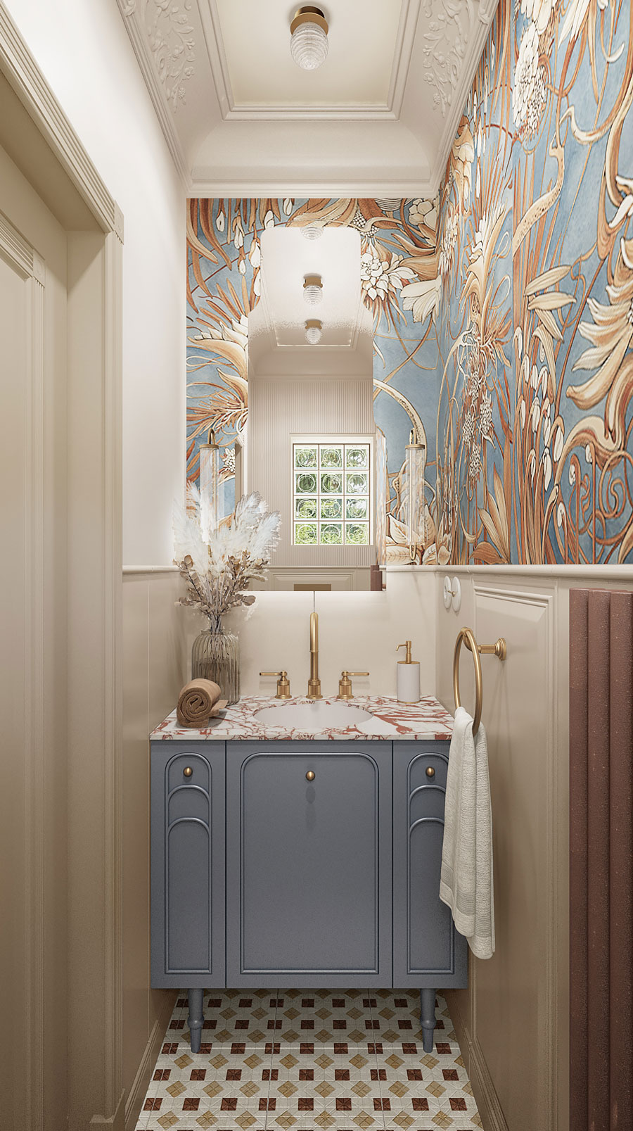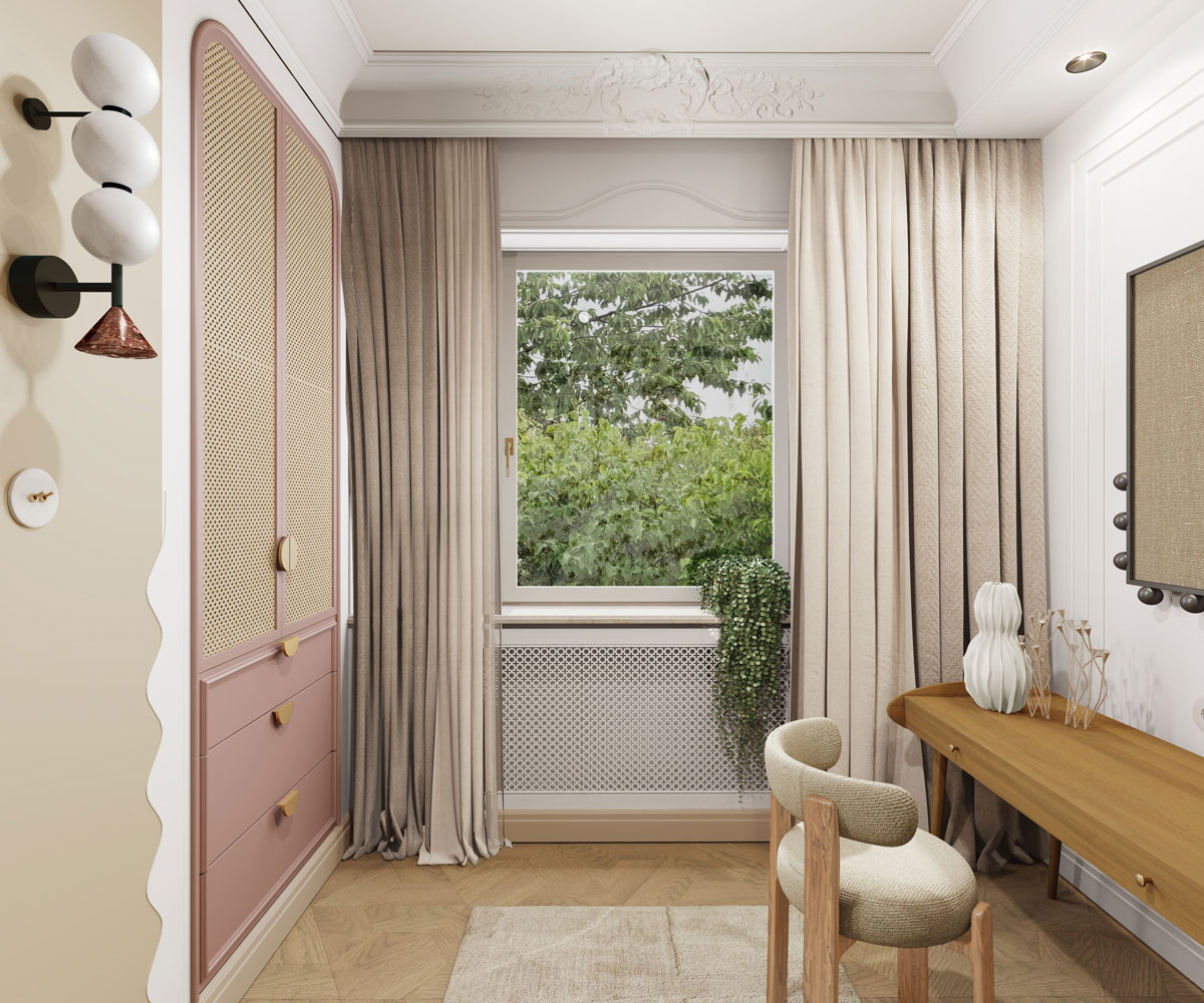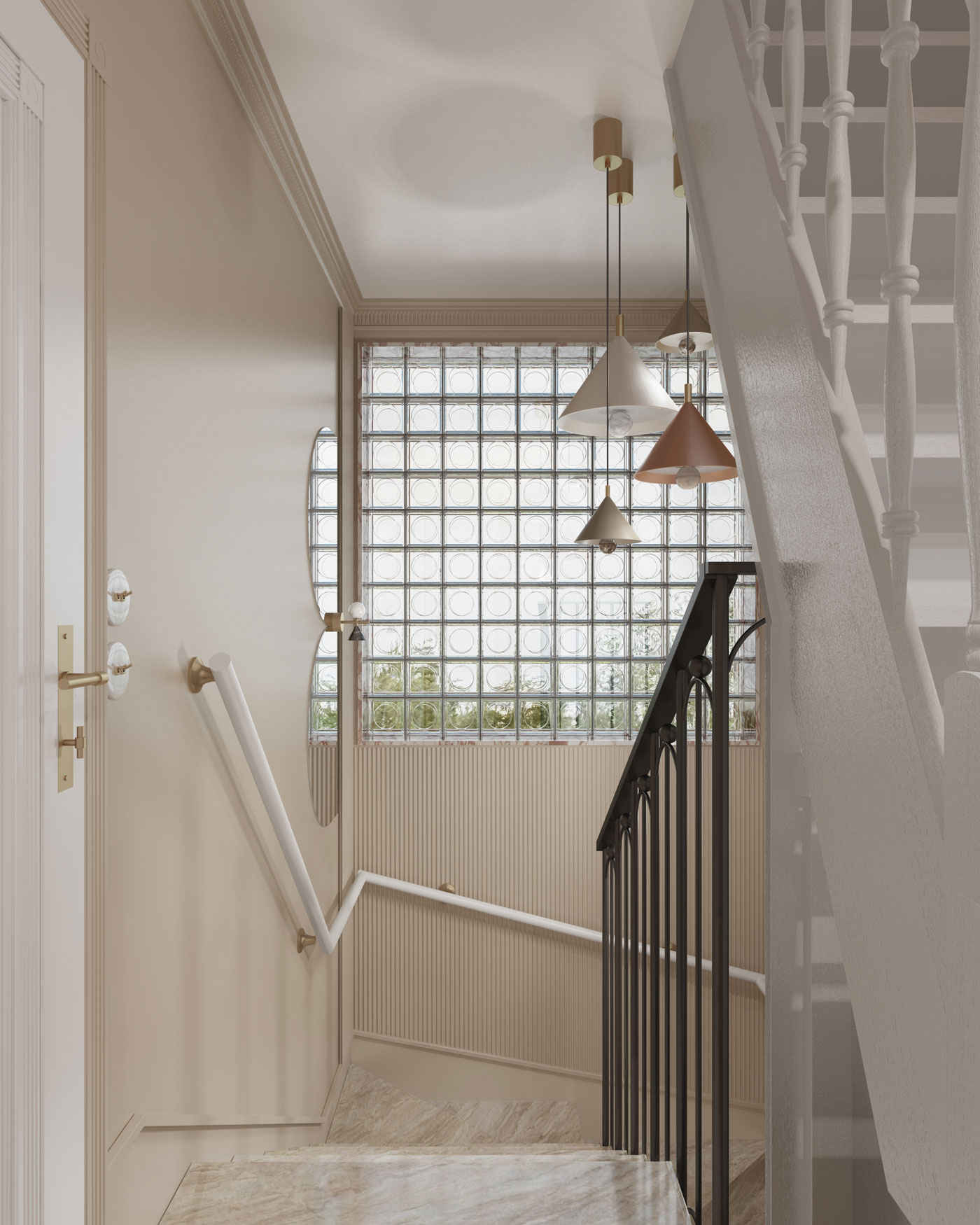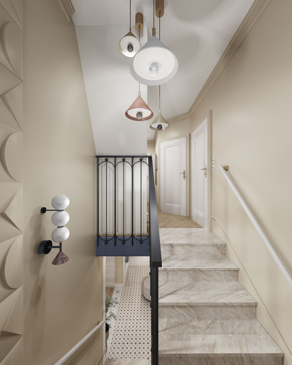 Wnętrza oparte są na jasnym drewnie, beżu i bieli, które zostały zrównoważone mocnymi akcentami bordo, różu i szarego błękitu. Ta zmysłowa paleta przejawia się w płytkach z finezyjnymi wzorami oraz w indywidualnie zaprojektowanych meblach — od witrażowych kredensów po dekoracyjne, portalowe wejścia.