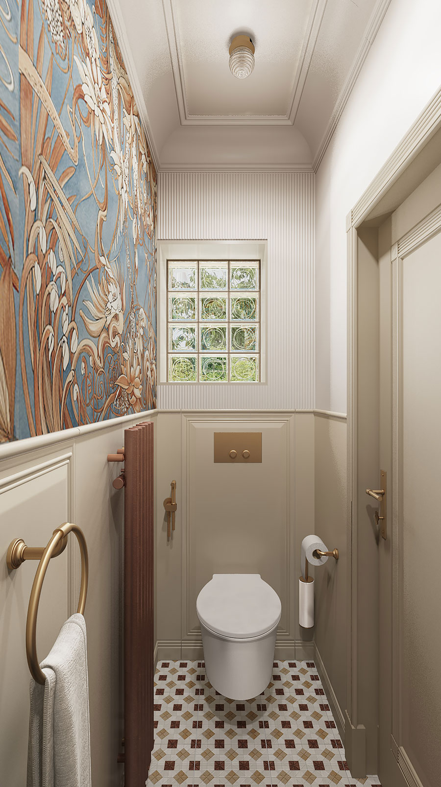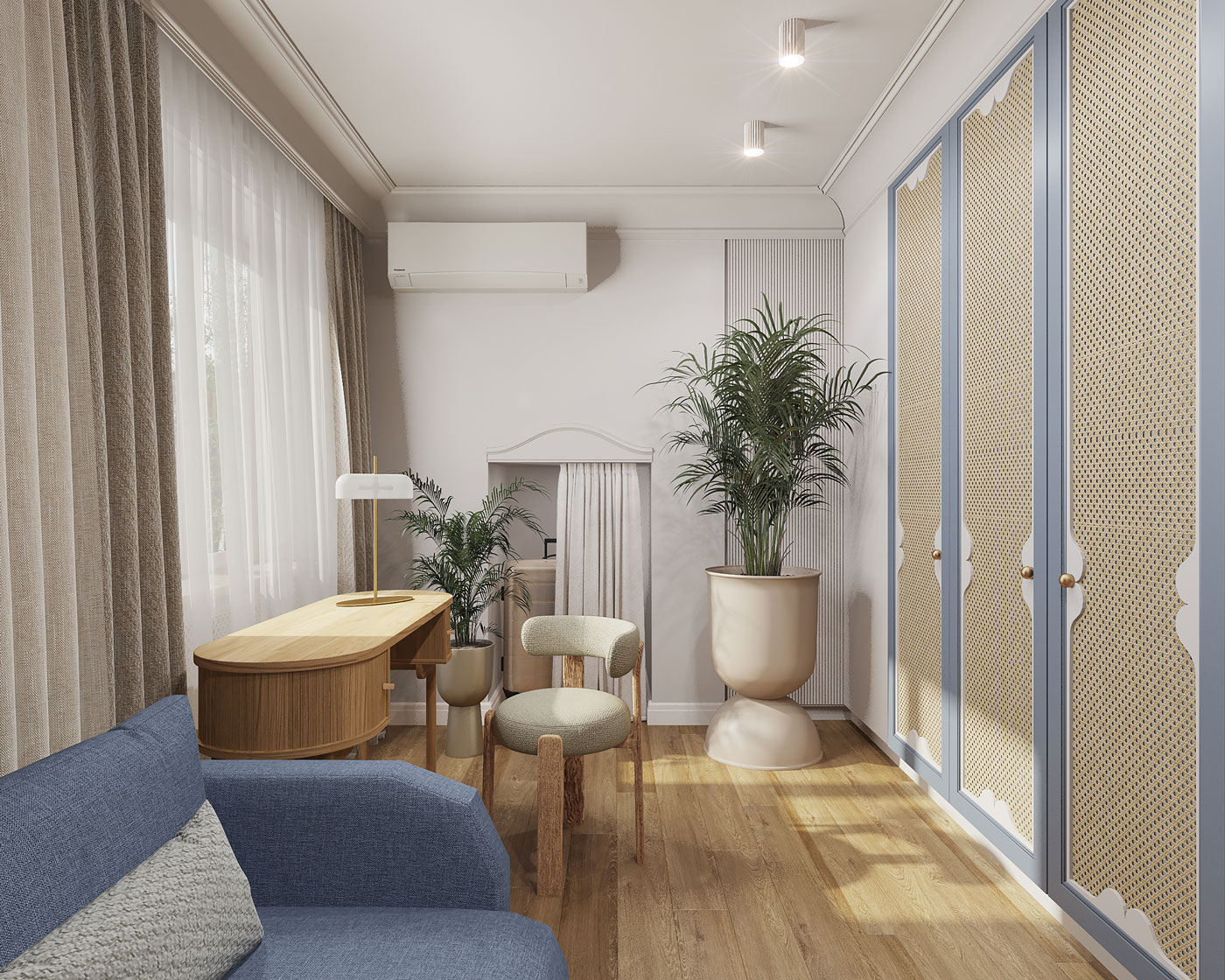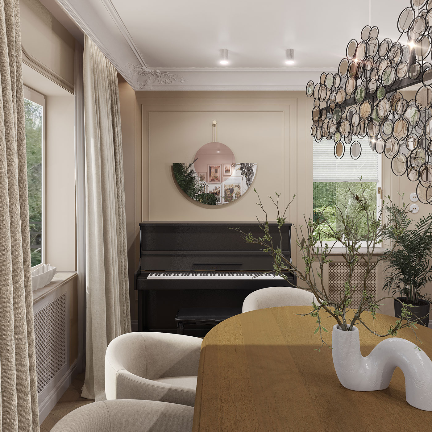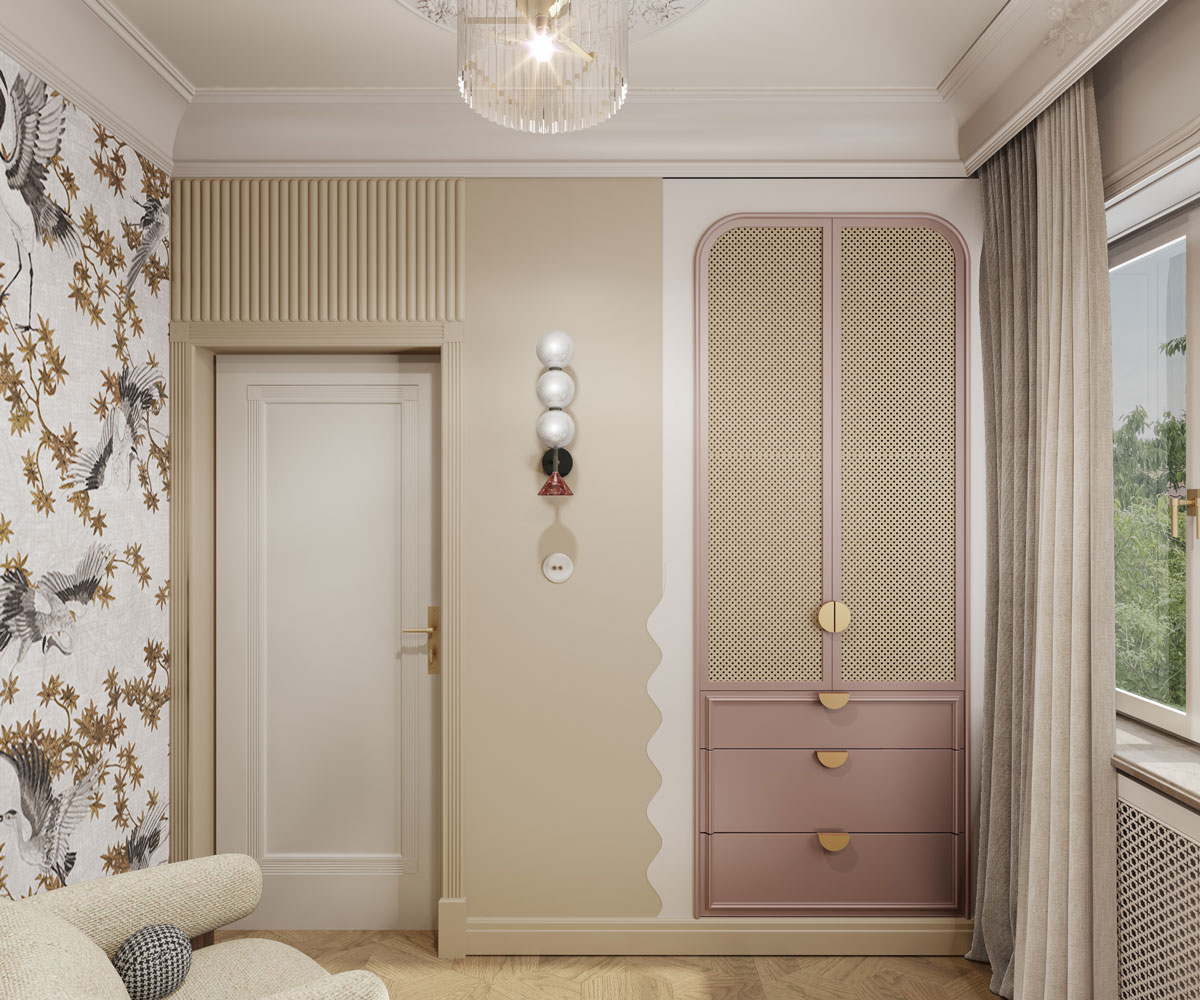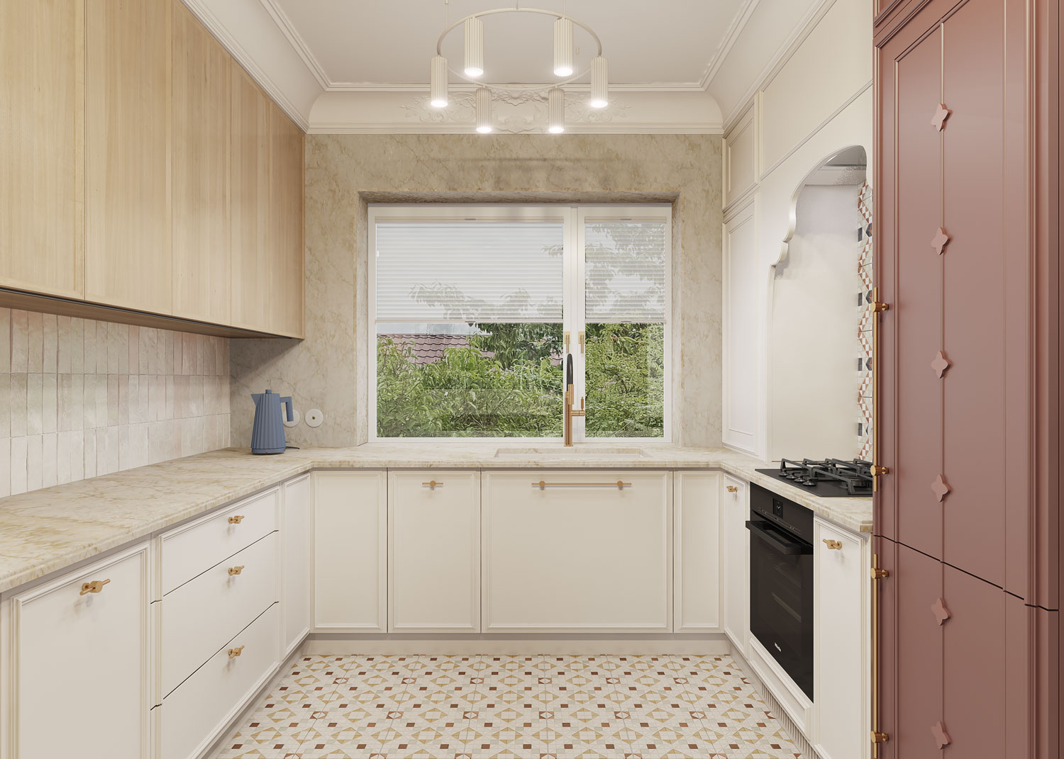 Wnętrza oparte są na jasnym drewnie, beżu i bieli, które zostały zrównoważone mocnymi akcentami bordo, różu i szarego błękitu. Ta zmysłowa paleta przejawia się w płytkach z finezyjnymi wzorami oraz w indywidualnie zaprojektowanych meblach — od witrażowych kredensów po dekoracyjne, portalowe wejścia.