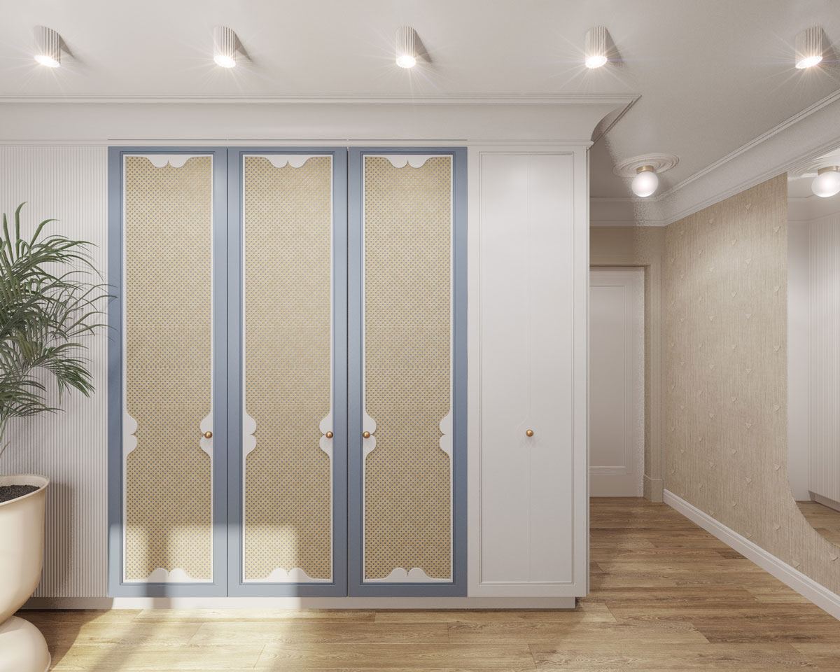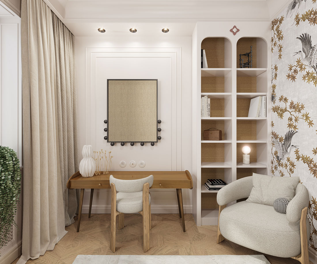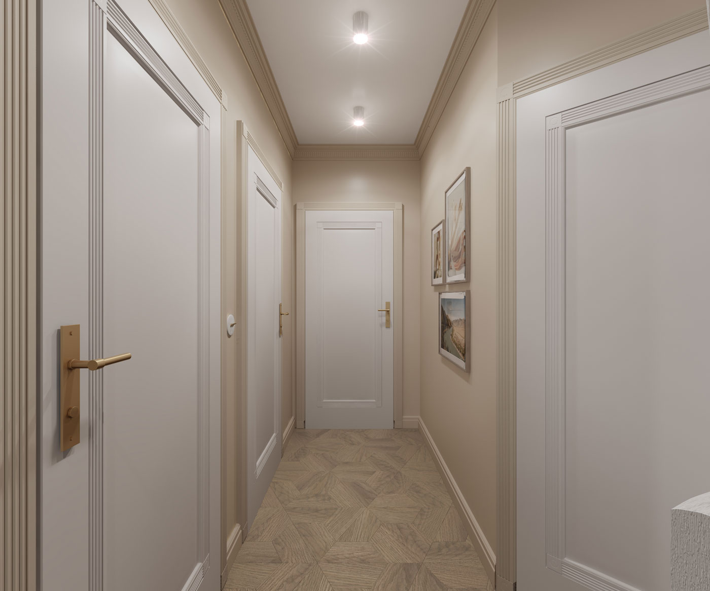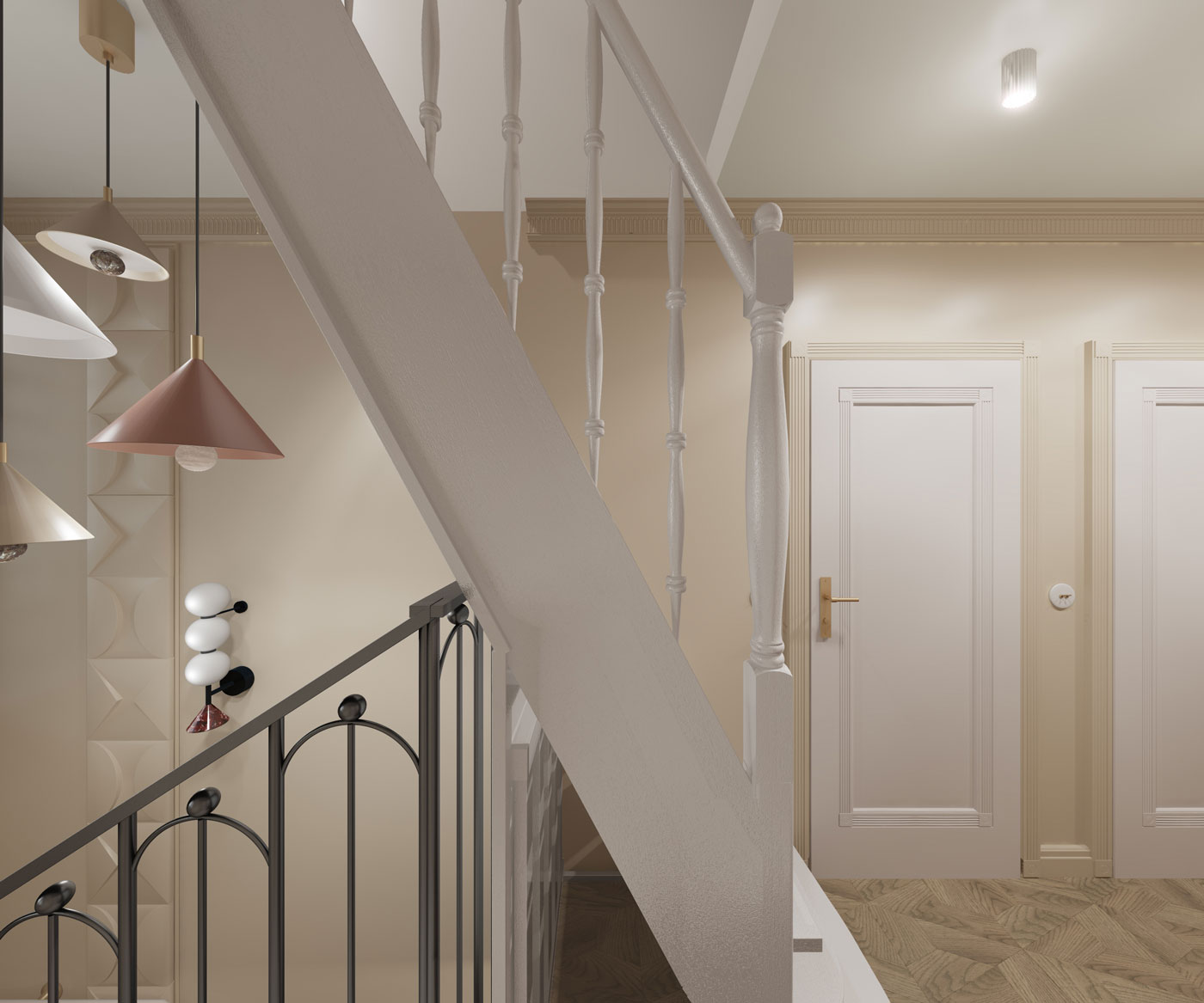 Estetyczna lekkość łączy się tu z ergonomią: kuchnia została powiększona i zaprojektowana tak, by naturalnie wypełniała przestrzeń funkcjonalnością, a dotychczas klaustrofobiczne WC zyskało wygodę i oddech. Całość dopełniają ukryte zabudowy, które porządkują codzienność i nadają wnętrzom spójnej harmonii. To przestrzeń, w której blask spotyka funkcję — dom, który świeci pięknem i komfortem.