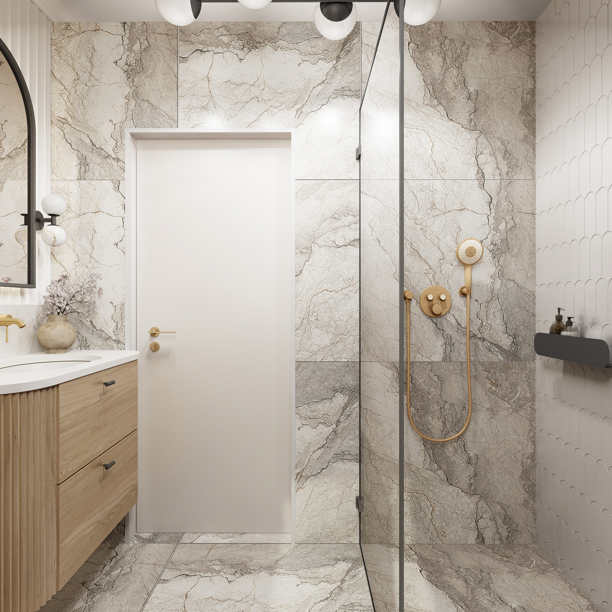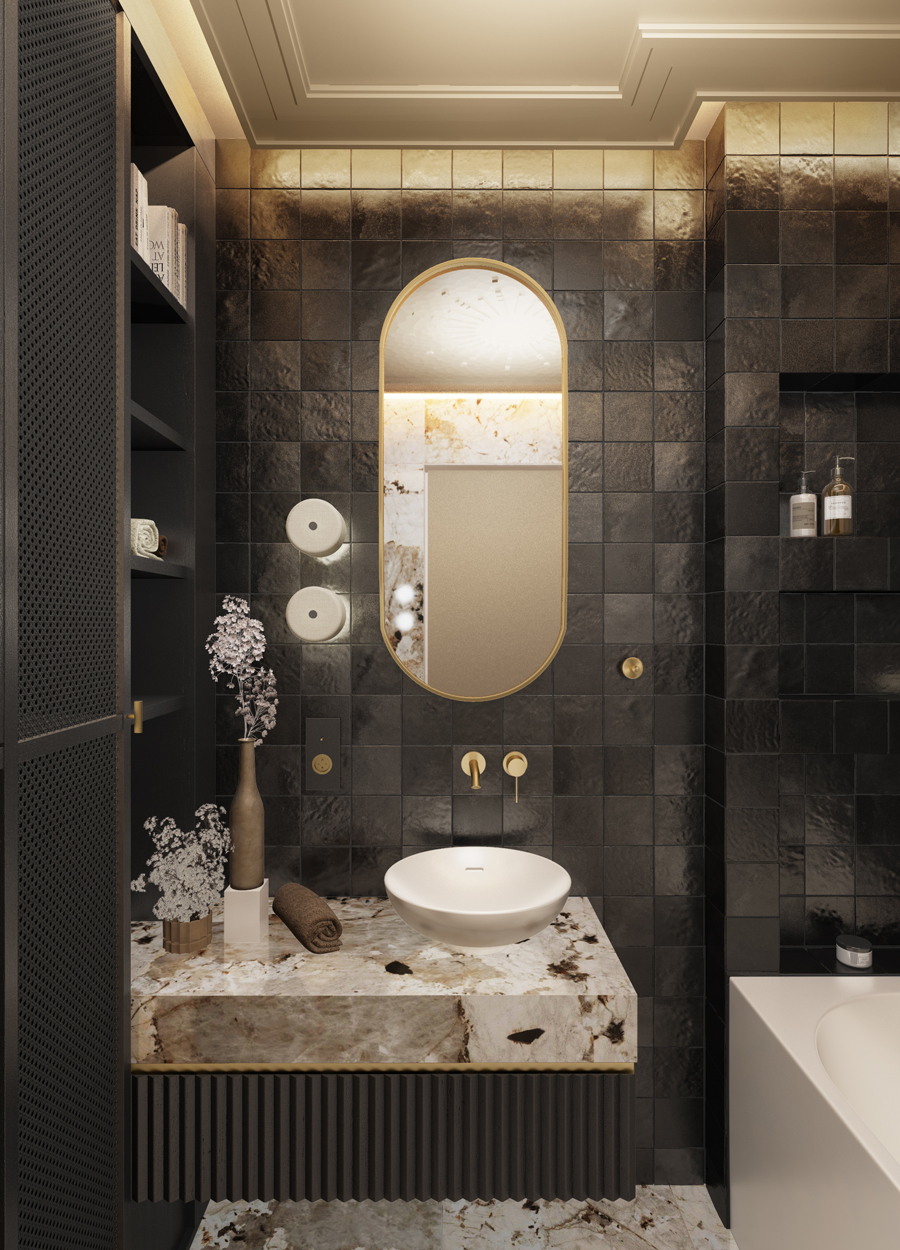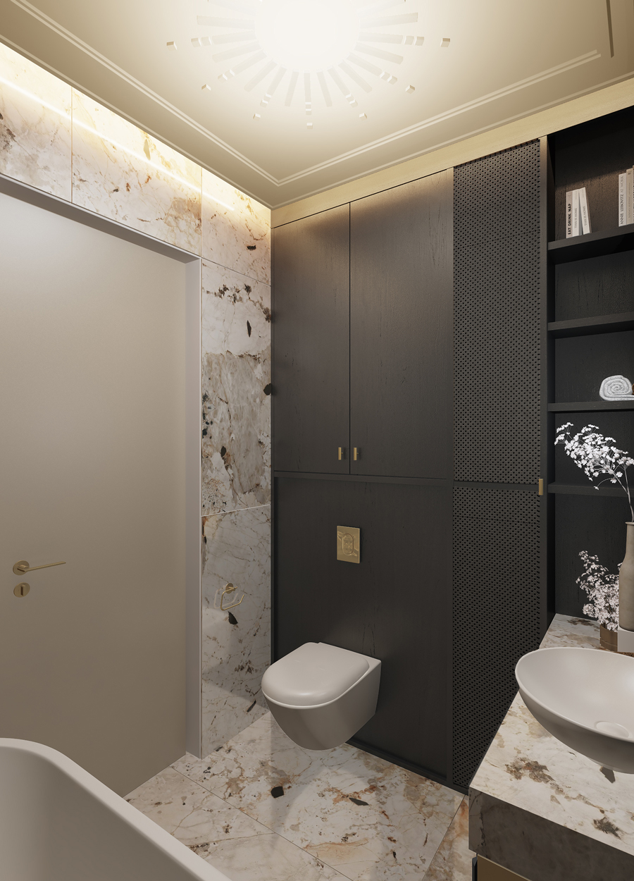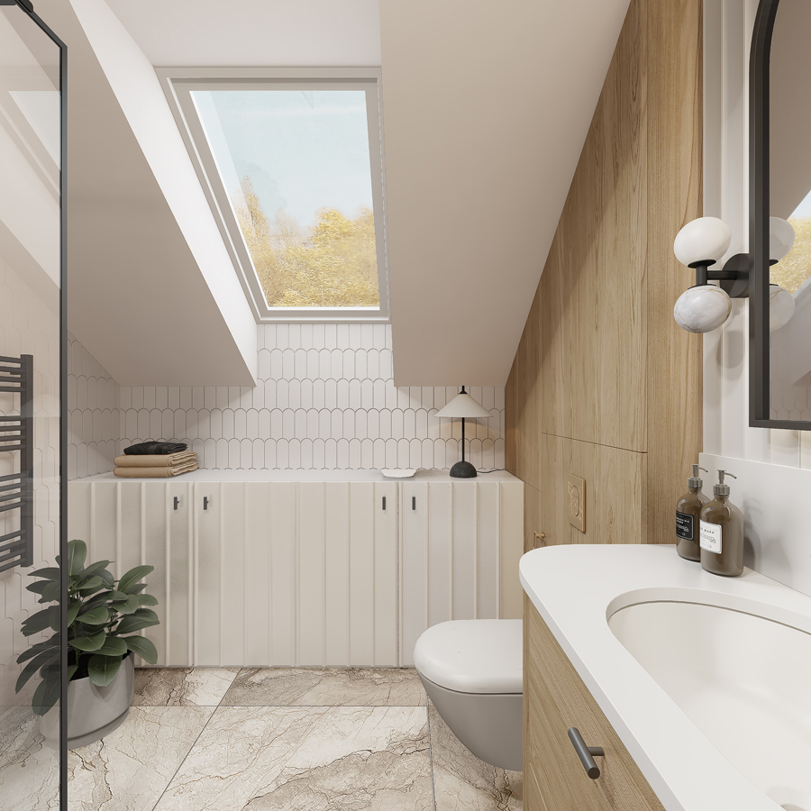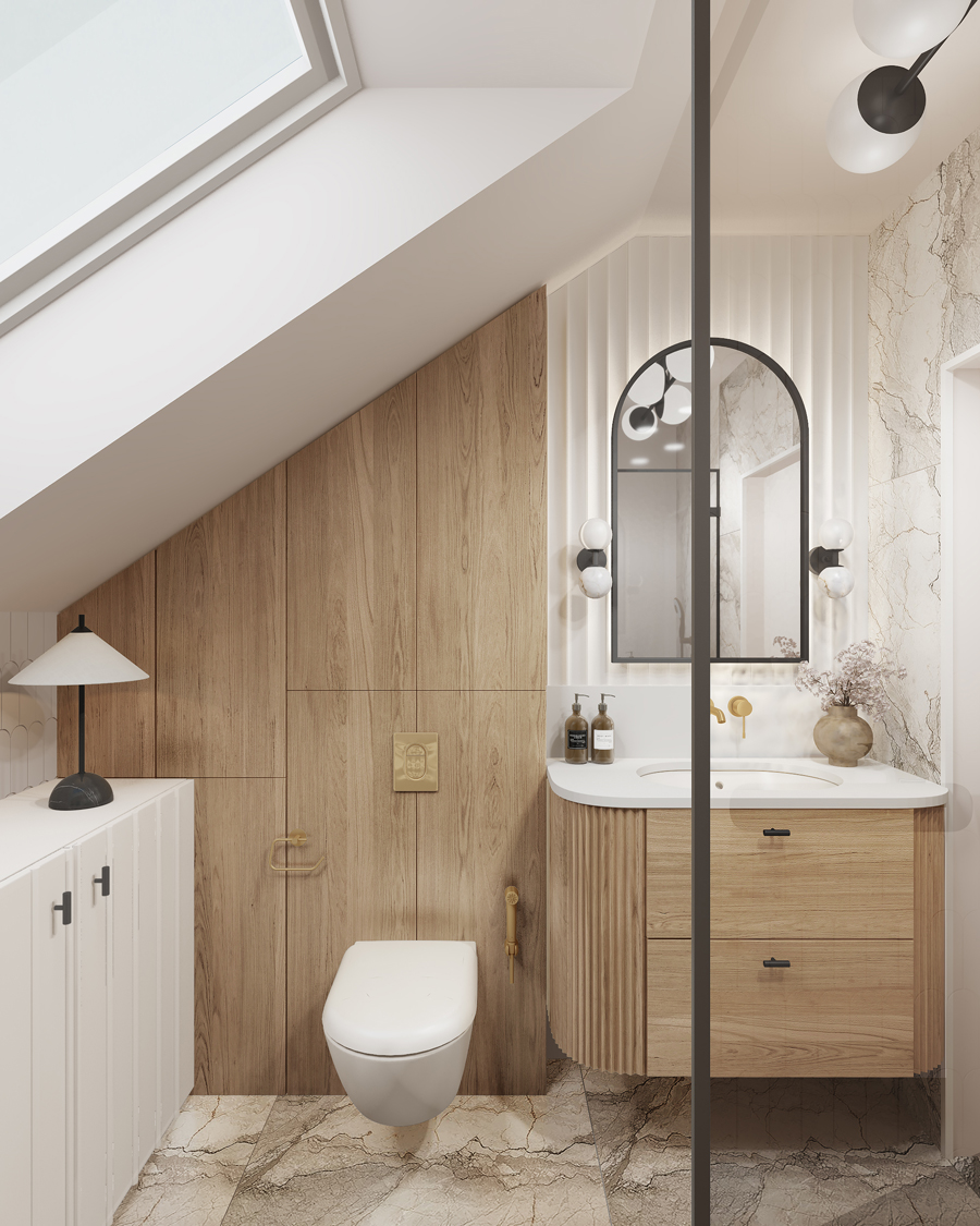Łazienki kontrastują ze sobą nie tylko kolorystyką, ale i nastrojem. Parterowa – ciemna, z mocnym rysunkiem kamienia i złotymi detalami. Piętro – jasne, neutralne, pod skosami – zaprojektowane z dbałością o proporcje i wyposażenie mimo ograniczeń przestrzennych.