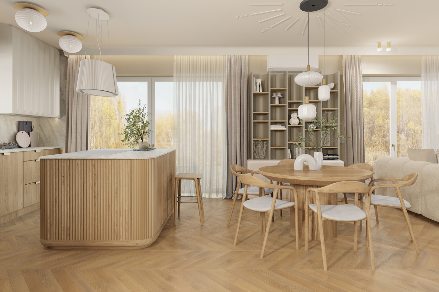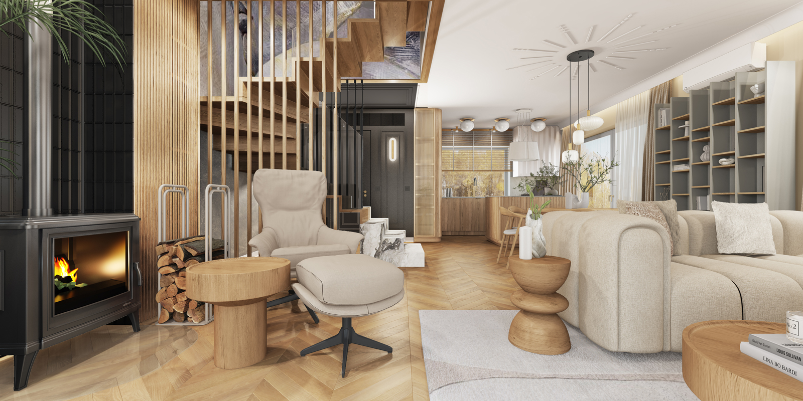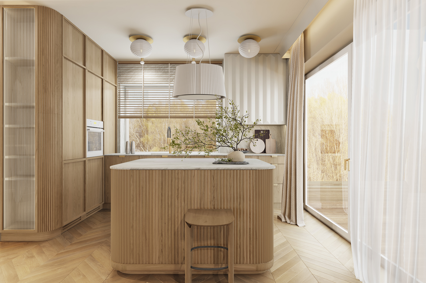W kuchni i strefie dziennej dominują jasne tonacje drewna, strukturalne okładziny i autorskie detale meblowe. Zaoblone cokoły i miękkie linie wyspy kuchennej wprowadzają łagodność do funkcjonalnej przestrzeni.
