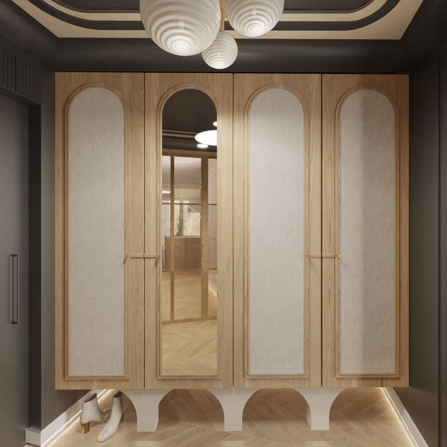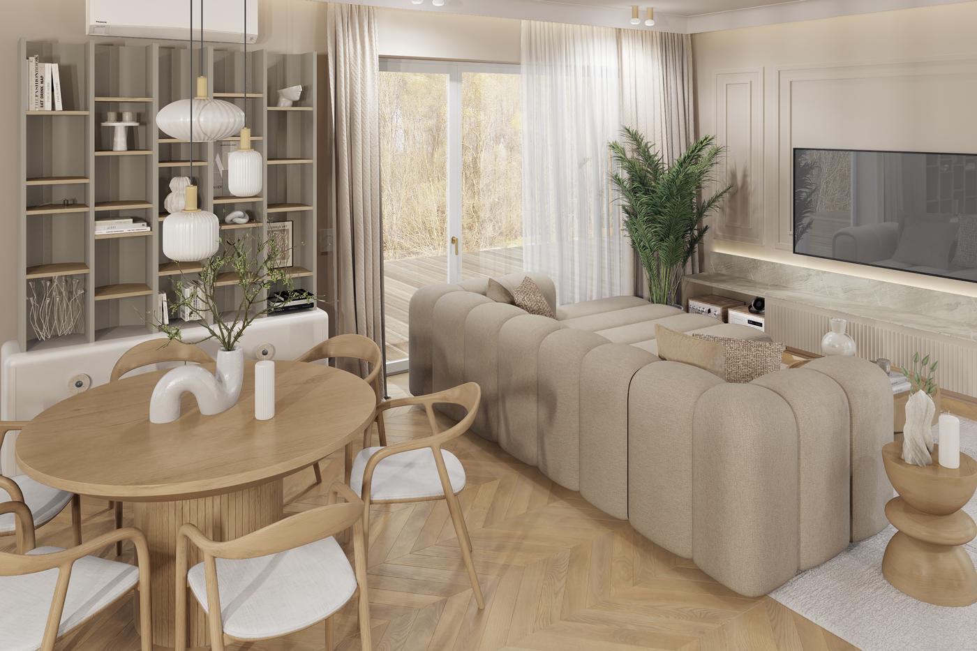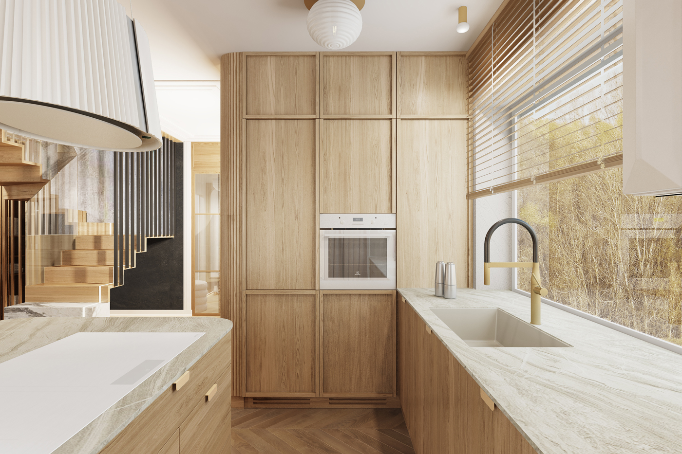 W kuchni i strefie dziennej dominują jasne tonacje drewna, strukturalne okładziny i autorskie detale meblowe. Zaoblone cokoły i miękkie linie wyspy kuchennej wprowadzają łagodność do funkcjonalnej przestrzeni.