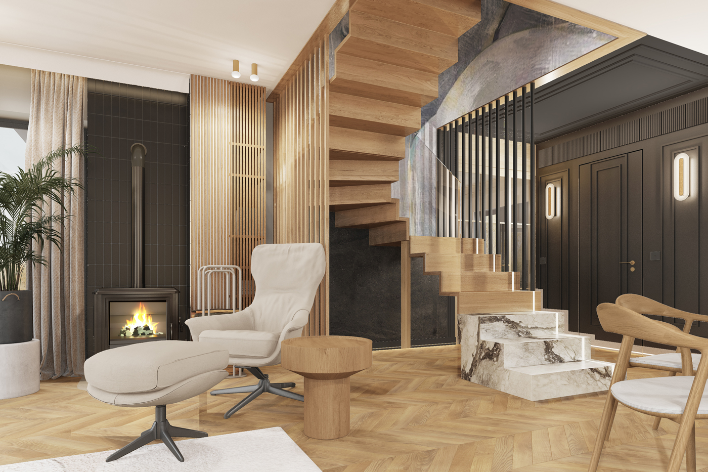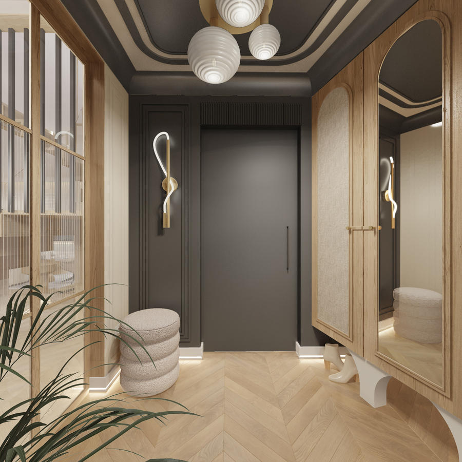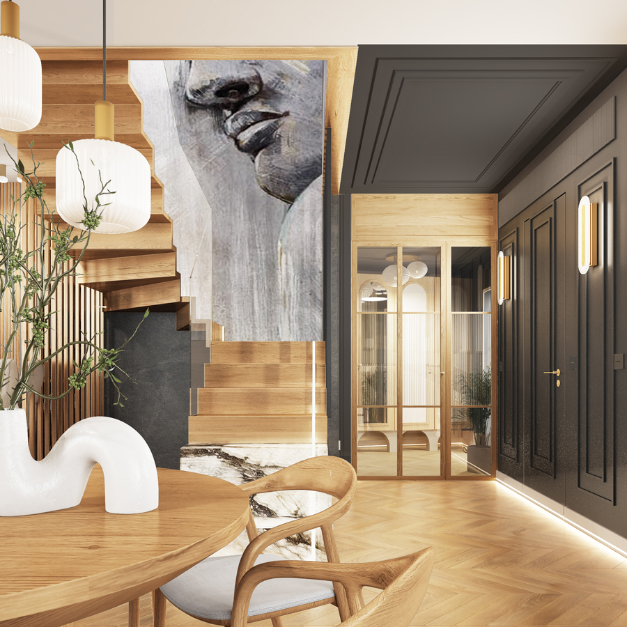 Klatka schodowa i przedsionek to miejsca o silniejszym wyrazie – pojawia się tu czerń, gra światła i graficzne akcenty, w tym wyrazista tapeta i rytmiczne lamele, które nadają wnętrzu architektoniczną głębię.